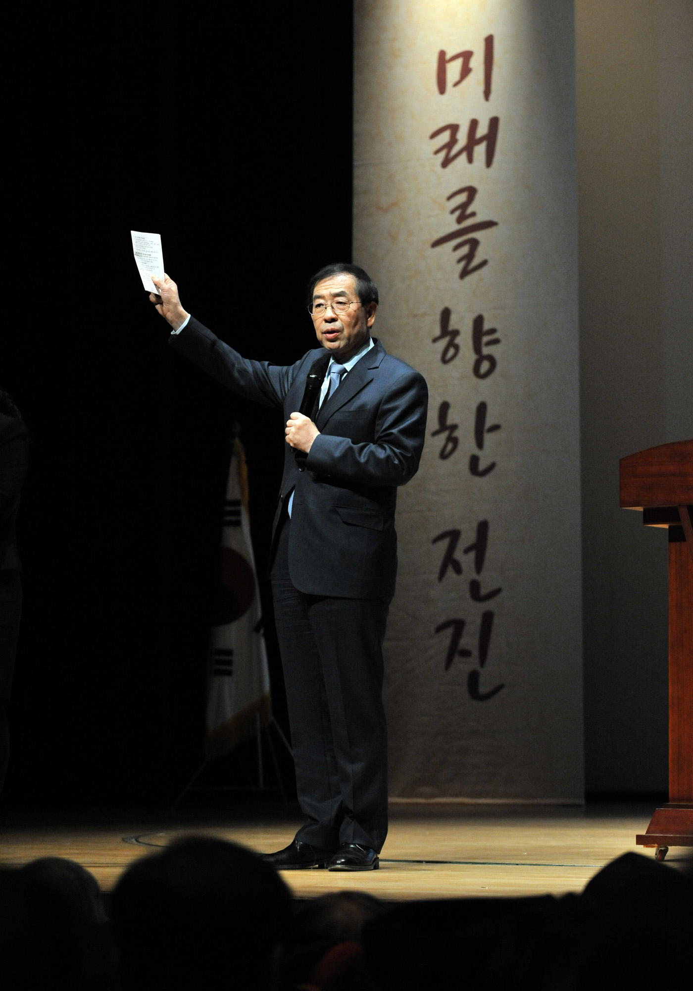 6일 오후 서울 금천구 금나래아트홀에서 열린 ‘2017년 금천구 신년인사회’에서 박원순 서울시장(왼쪽 두번째)과 차성수 금천구청장(왼쪽)이 주민들과 악수를 하고 있다. 서울시 제공