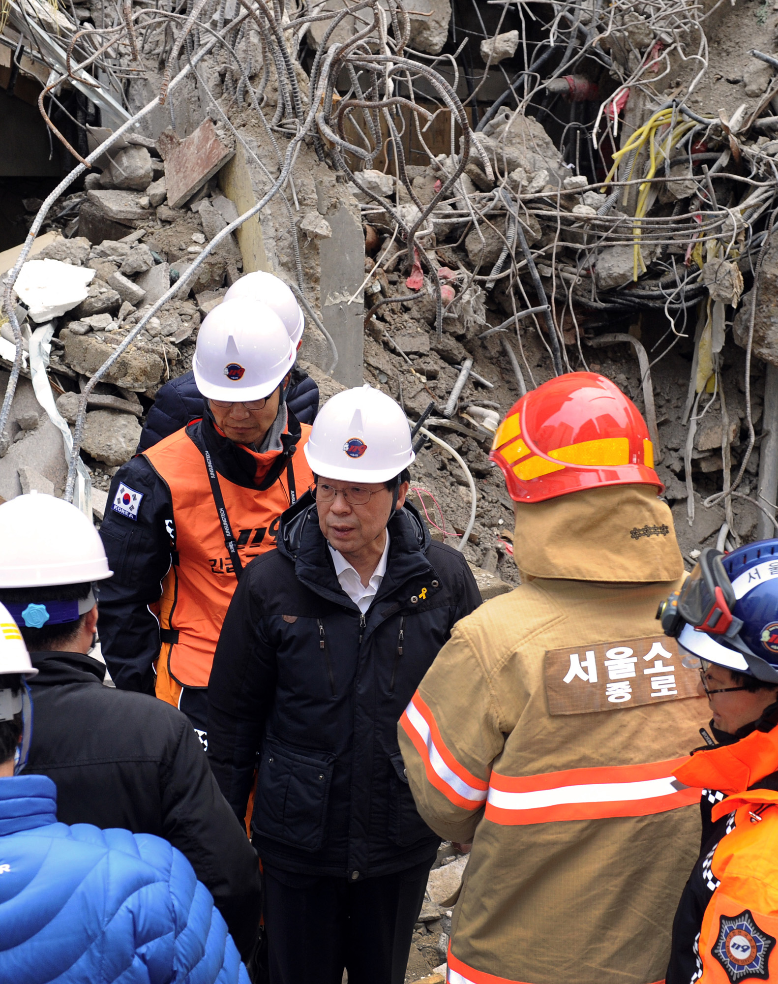 박원순 서울시장이 8일 오후 서울 종로구 낙원동 호텔 철거 붕괴사고 현장을 찾아 구조 상황을 점검하고 있다. 서울시 제공