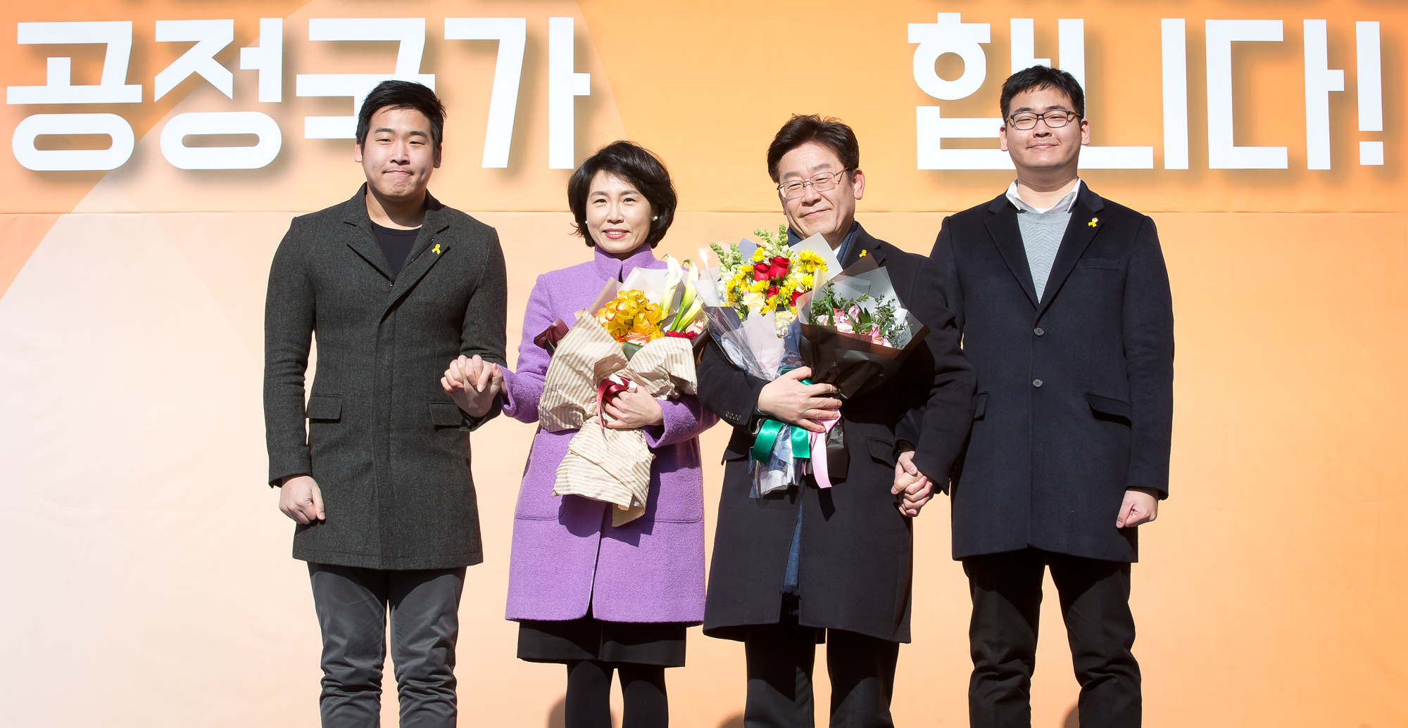 [성남=eoimage] 임준선 기자 = 이재명 성남시장이 23일 오전 경기 성남시 오리엔트 공장에서 19대 대통령선거 출마를 선언을 한 후 가족들과 함께 인사를 하고 있다.