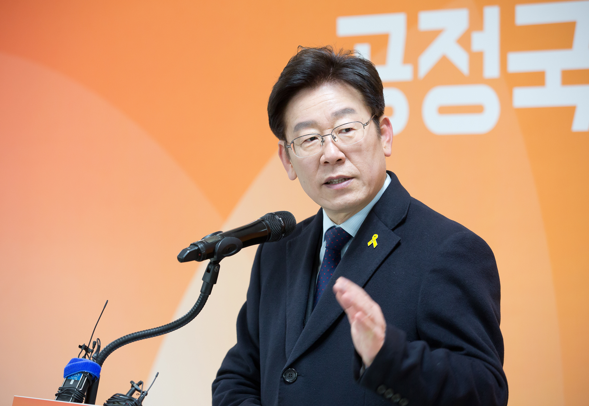 [성남=eoimage] 임준선 기자 = 이재명 성남시장이 23일 오전 경기 성남시 오리엔트 공장에서 19대 대통령선거 출마를 선언을 한 후, 기자회견을 하고 있다.
