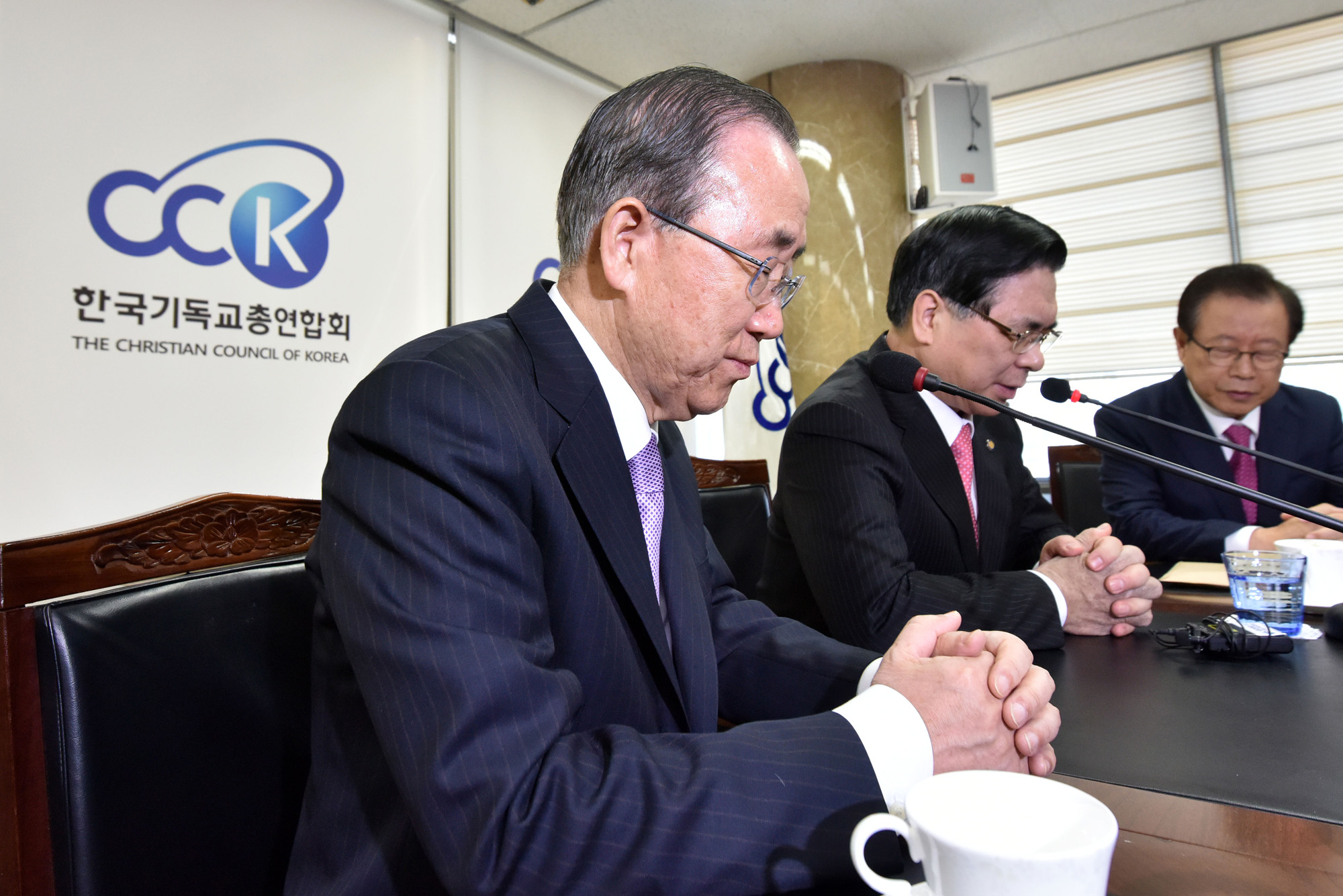 반기문 전 유엔 사무총장이 24일 오전 서울 종로구 연지동 한국기독교연합회관에서 한국기독교총연합회 대표회장 이영훈 목사와 함께 기도를 하고 있다.2017.01.24 사진/임준선기자(현장풀)