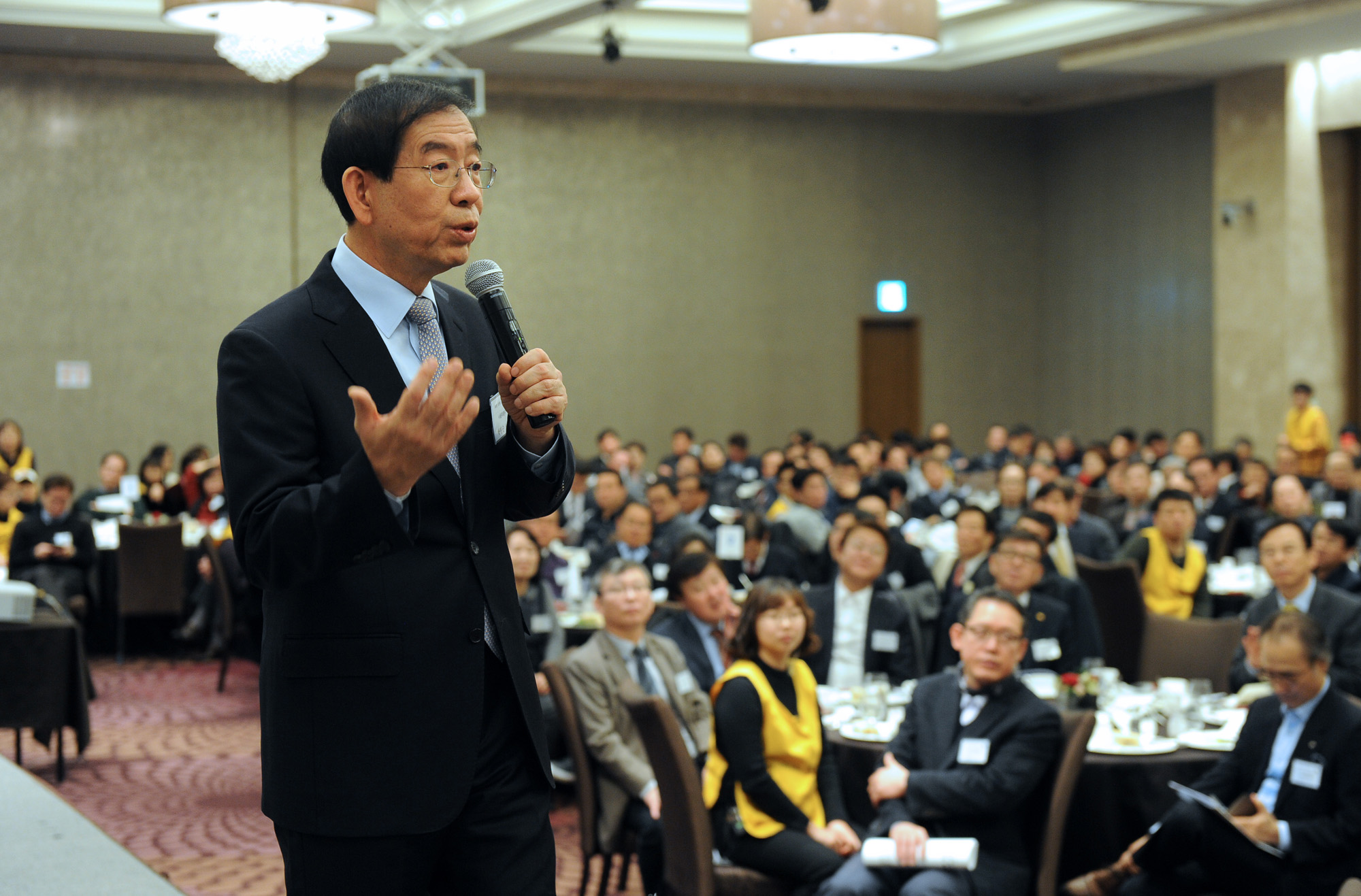 박원순 서울시장이 18일 오전 서울 구로구 신도림 쉐라톤 서울디큐브시티호텔에서 열린 '중소기업정책 300인 원탁토론회'에서 '중소기업과 중소공인을 위한 경제만들기'를 주제로 기조발제를 하고 있다. 서울시 제공