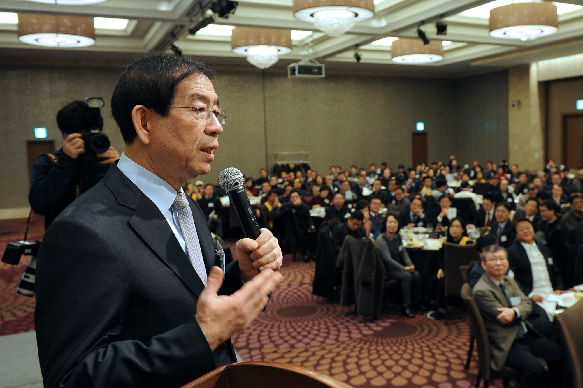 박원순 서울시장이 18일 오전 서울 구로구 신도림 쉐라톤 서울디큐브시티호텔에서 열린 '중소기업정책 300인 원탁토론회'에서 '중소기업과 중소공인을 위한 경제만들기'를 주제로 기조발제를 하고 있다. 서울시 제공