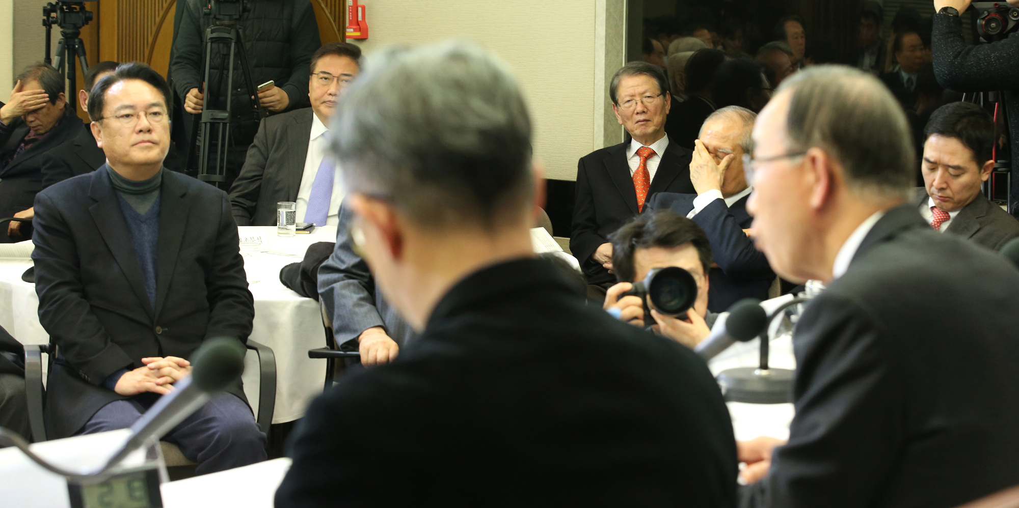 반기문 전 유엔 사무총장이 25일 오후 서울 중구 프레스센터에서 열린 관훈토론회에서 기조연설을 하고 있다. 맨왼쪽 정진석 전 새누리당 원내대표가 연설을 경청하고 있다.2017.01.25 사진/임준선기자(현장풀)