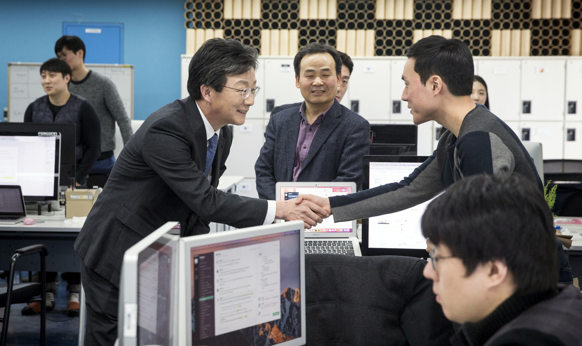 바른정당 유승민 의원이 2017년 2월 2일 서울 강남구 역삼동 디캠프를 방문해 스타트업 기업 대표들과 인사를 나누고 있다. 2017.02.02 사진 임준선기자(현장풀)