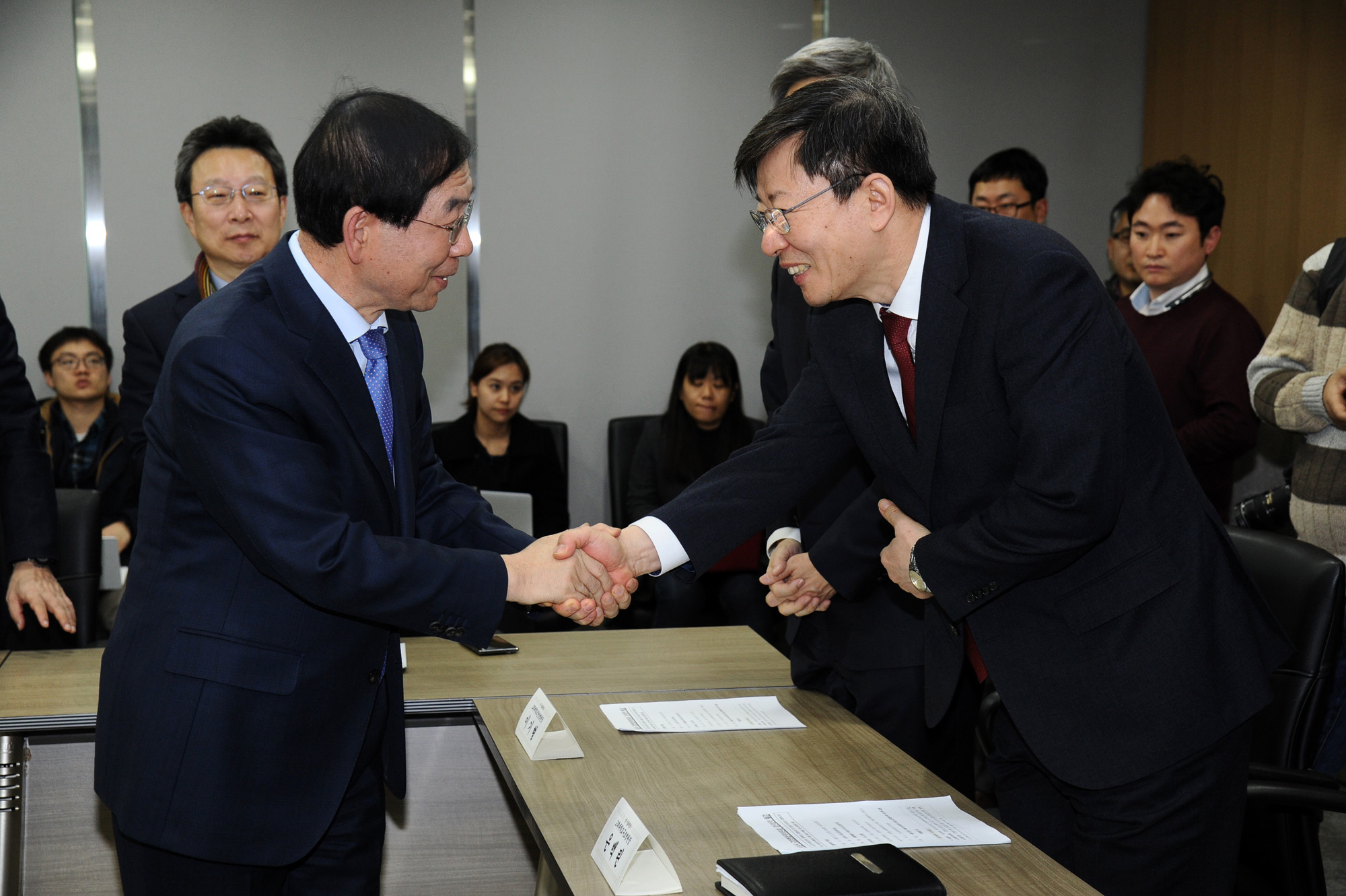 2일 오후 서울 중구 서울시청 영상회의실에서 열린 서울시 감염병협력위원회 업무협약식에서 박원순 서울시장과 김숙희(왼쪽) 서울시 의사회장이 협약서를 들고 기념촬영을 하고 있다. 서울시 제공