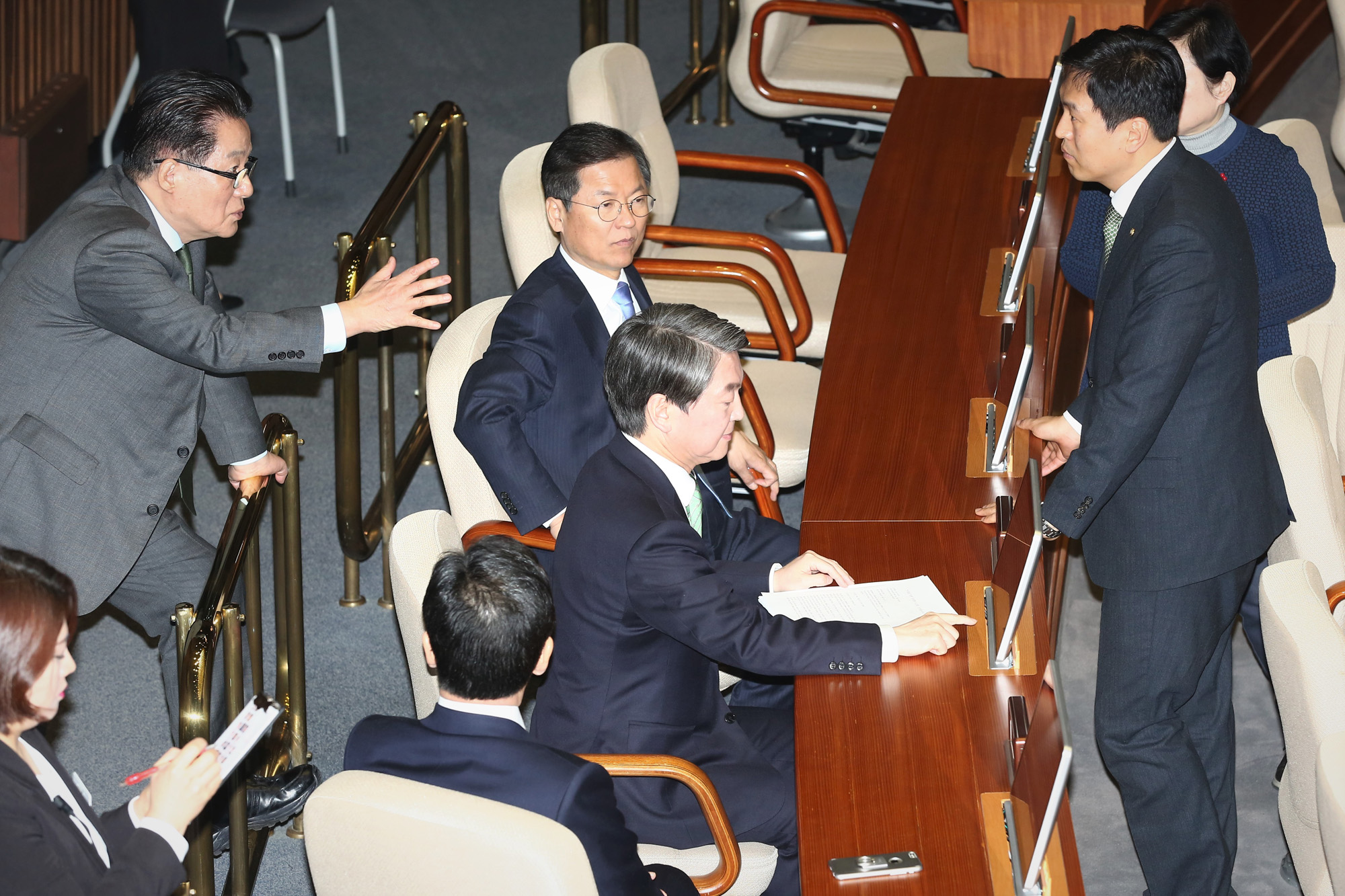 | 사진설명 | [eoimage=서울] 박은숙 기자 = 주승용(왼쪽부터) 국민의당 원내대표, 박지원 대표, 안철수 전 상임공동대표, 천정배 전 상임공동대표가 6일 오전 서울 여의도 국회에서 열린 본회의에 참석해 대화하고 있다. 2017.2. 6 eomaster@eoimage.com |