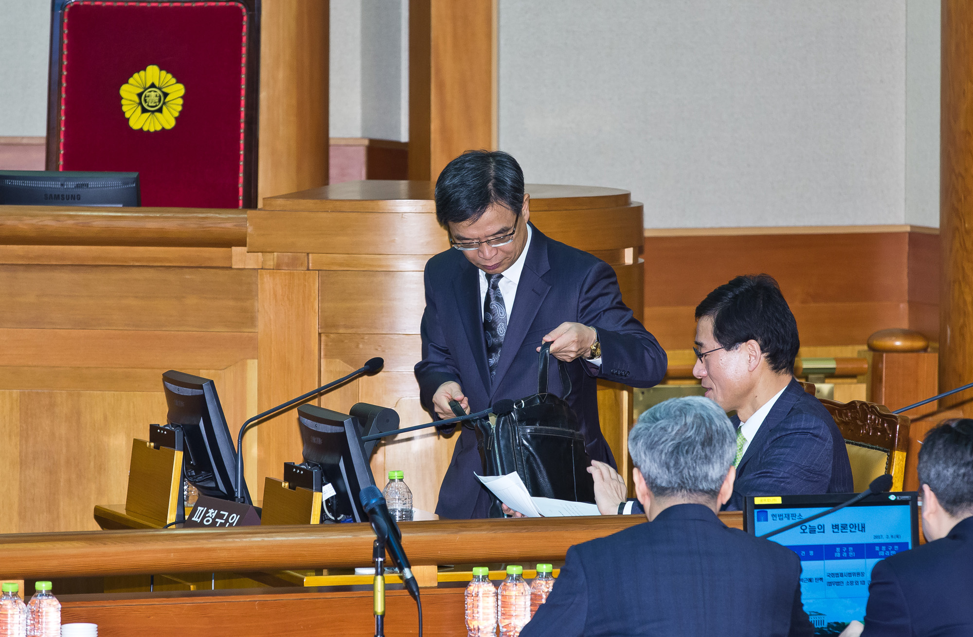 | 사진설명 | [서울=eoimage] 최준필 기자 = 박근혜 대통령 탄핵심판 12차 변론기일인 9일 오전 서울 종로구 재동 헌법재판소 대심판정에서 피청구인 박근혜 대통령측의 이중환 변호사가 배석하고 있다. 17.02.09. eomaster@eoimage.com |