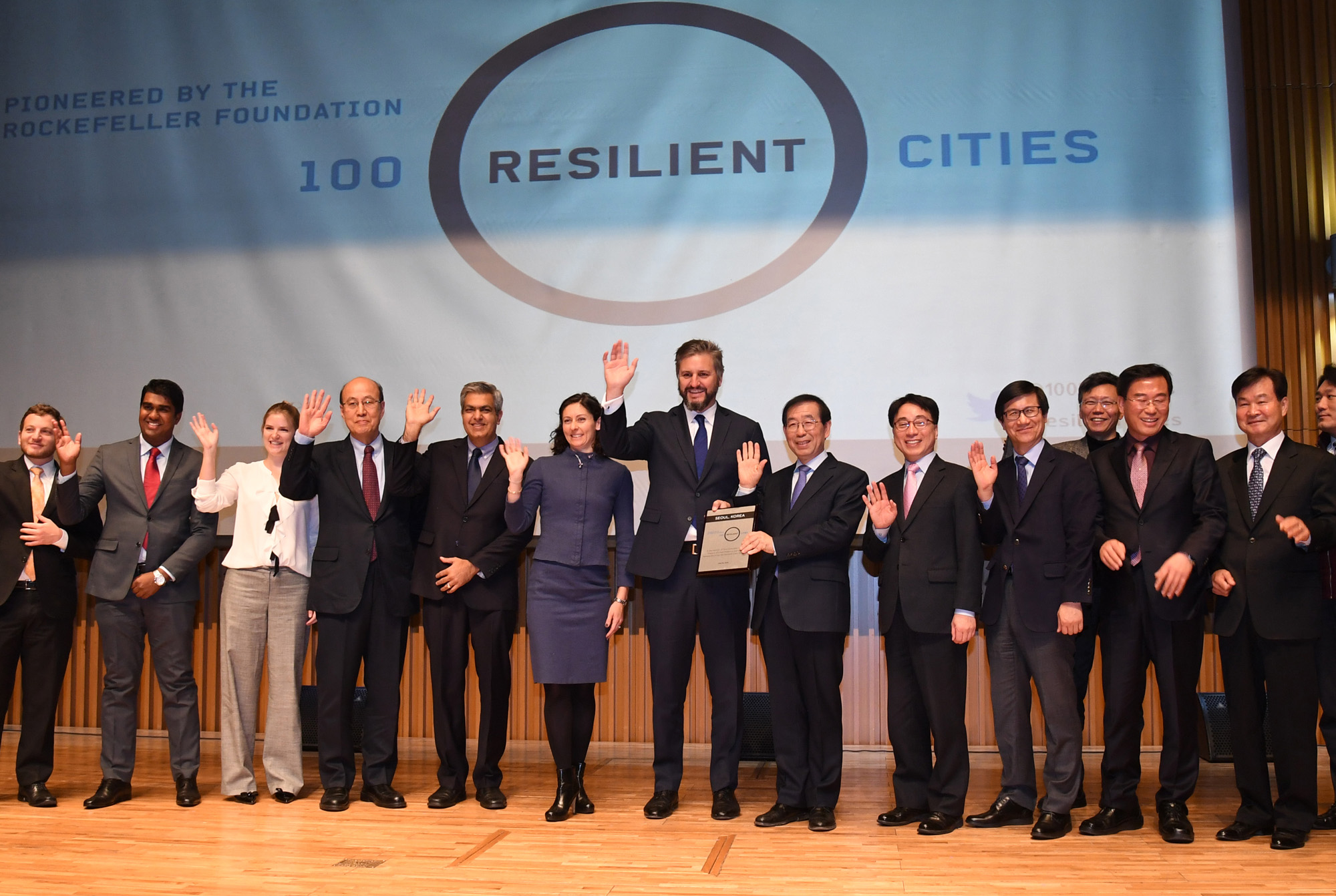 박원순 서울시장이 21일 서울시청 8층 다목절홀에서 100RC(세계100대 재난회복력 도시)의 마이클 버코위츠(Michael Berkowitz) 대표로부터 서울시의 세계 100대 재난회복력도시 선정패를 받았다. 서울시 제공