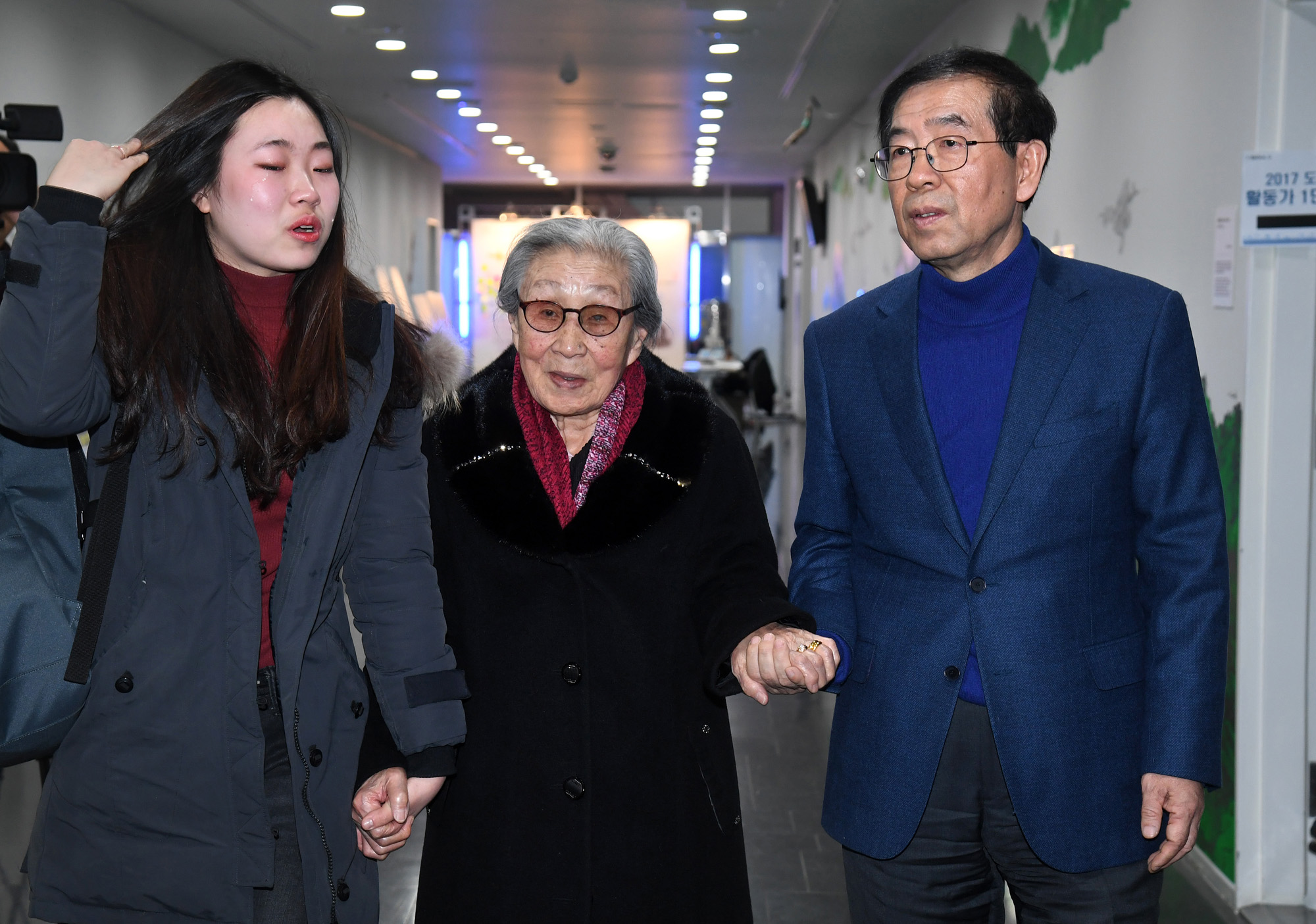 박원순 서울시장과 일본군 위안부 피해자 김복동 할머니가 22일 오후 서울 중구 서울시청에서 열린 문서와 사진 증언으로 보는 위안부 이야기 행사에 참석하며 복도에 전시된 위안부 피해자 작품을 감상하고 있다. 서울시 제공