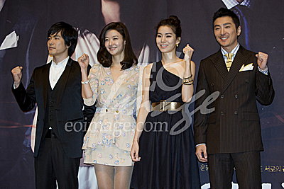 [서울=eoimage]박은숙기자=4일 오후 목동SBS에서 열린 SBS새아침드라마'녹색마차' 제작발표회에서 주연배우 정성환,송선미,황지현,류태준이 화이팅을 외치고 있다. 2009.05.04.eomaster@eoimage.com(끝)