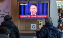 서울역에서 비상계엄 해제 뉴스 시청하는 시민들