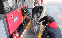 석유 최고가격제 시행, 유류 정량 확인하는 한국석유관리원 관계자들